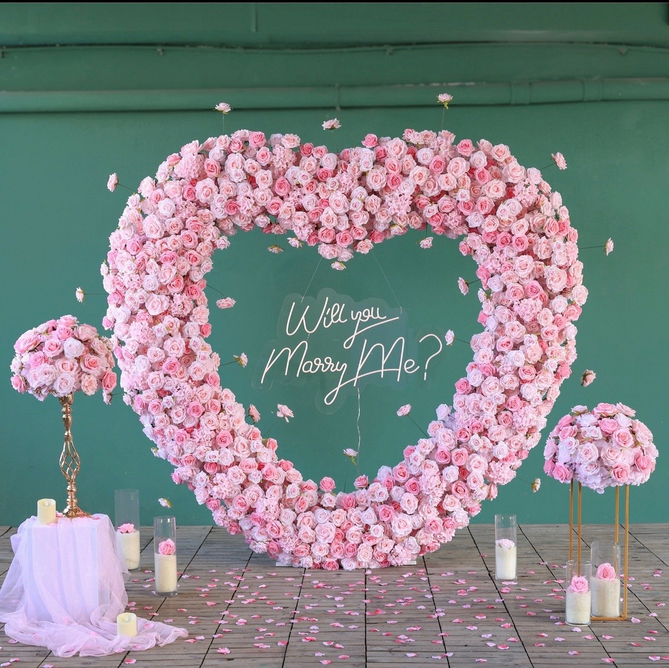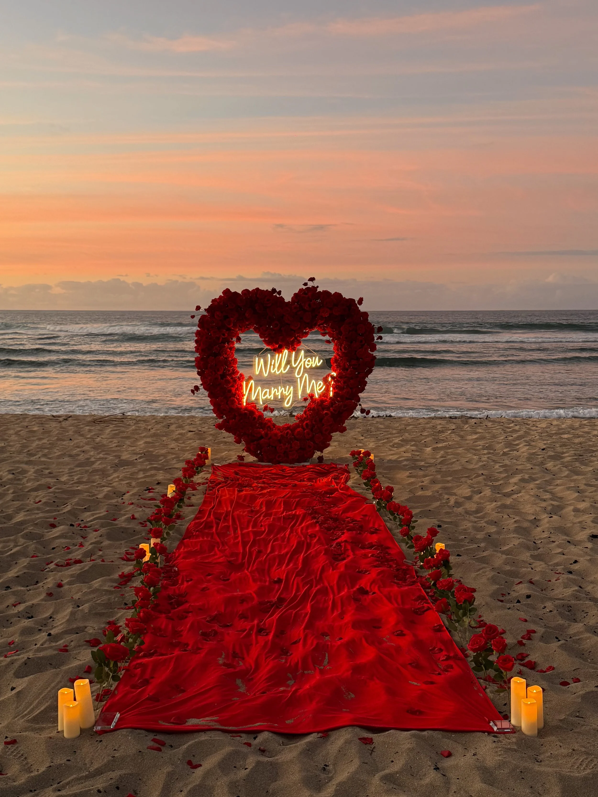 This package includes the heart arch, neon ‘Will You Marry Me?’ sign, and a flower candle carpet walkway with rose petals. Also included is your top five favorite love songs playing while you propose!